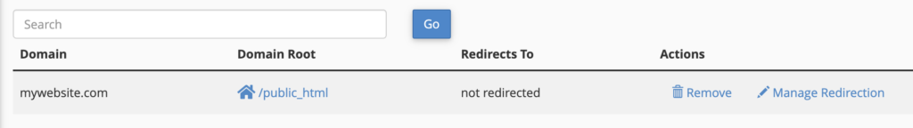 - Redirects to — you can redirect the domain to somewhere else, it shares the same feature as Aliases. Since we’re not doing that, it says not redirected. However, if you want to do that, simply click the Manage Redirection button, and it will open a new window where you can assign the path for redirection