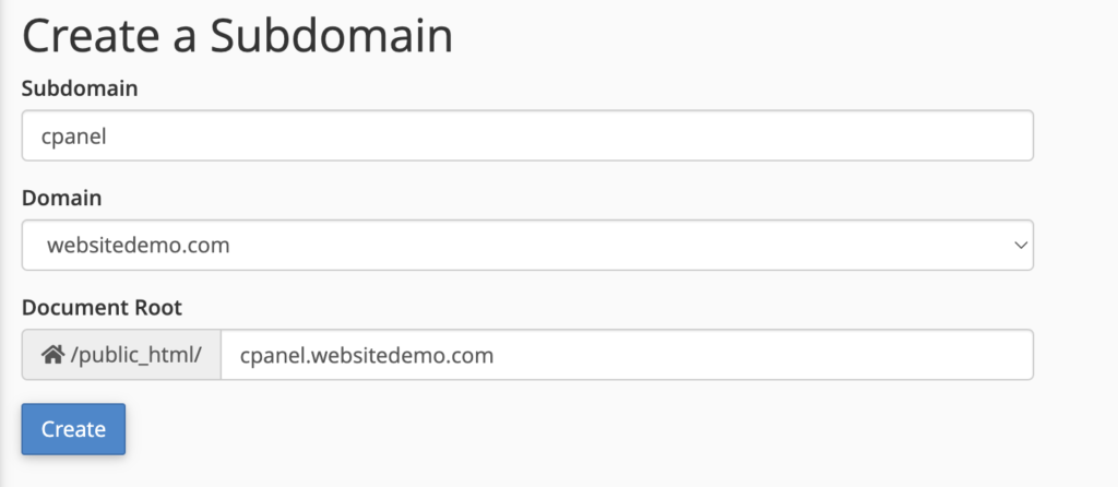 - Subdomain — cPanel will automatically add the subdomain name. If you only plan to add one domain name, leave that be. Otherwise, if you’re planning to add two domains with the same name but different TLDs, e.g., samedomainname.com and samedomainname.net, you need to modify it