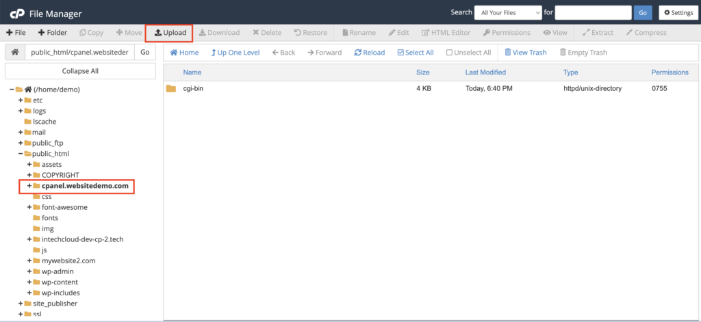 - From the folder tree section, navigate to your cpanel.yourdomain.com. Once you’re inside the directory, click the Upload button from the navigation bar.