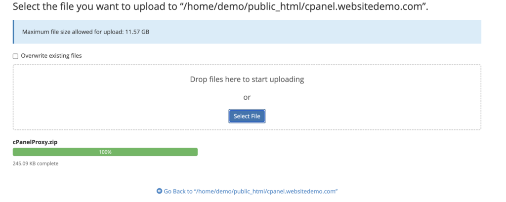 - It will open a new window. You can either drag and drop the cPanelProxy.zip file directly or select the file to upload it. Once the upload is completed, you can click the Go Back to link.