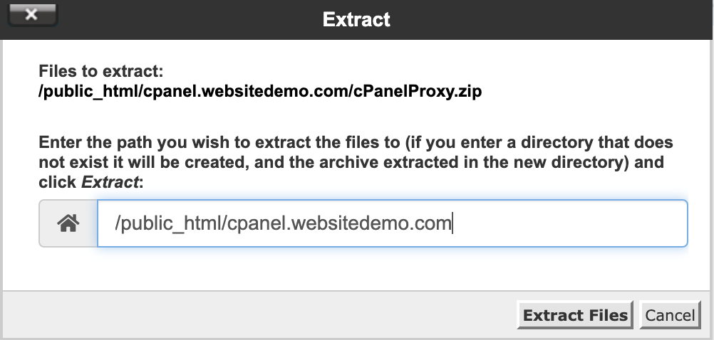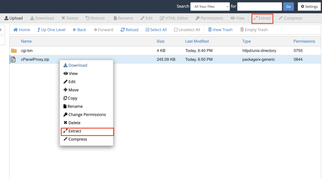 - Now the cPanel proxy tool should be placed in the directory, and the only thing left is to extract the file. You can either right click the file and choose Extract, or click the Extract button on the toolbar.
