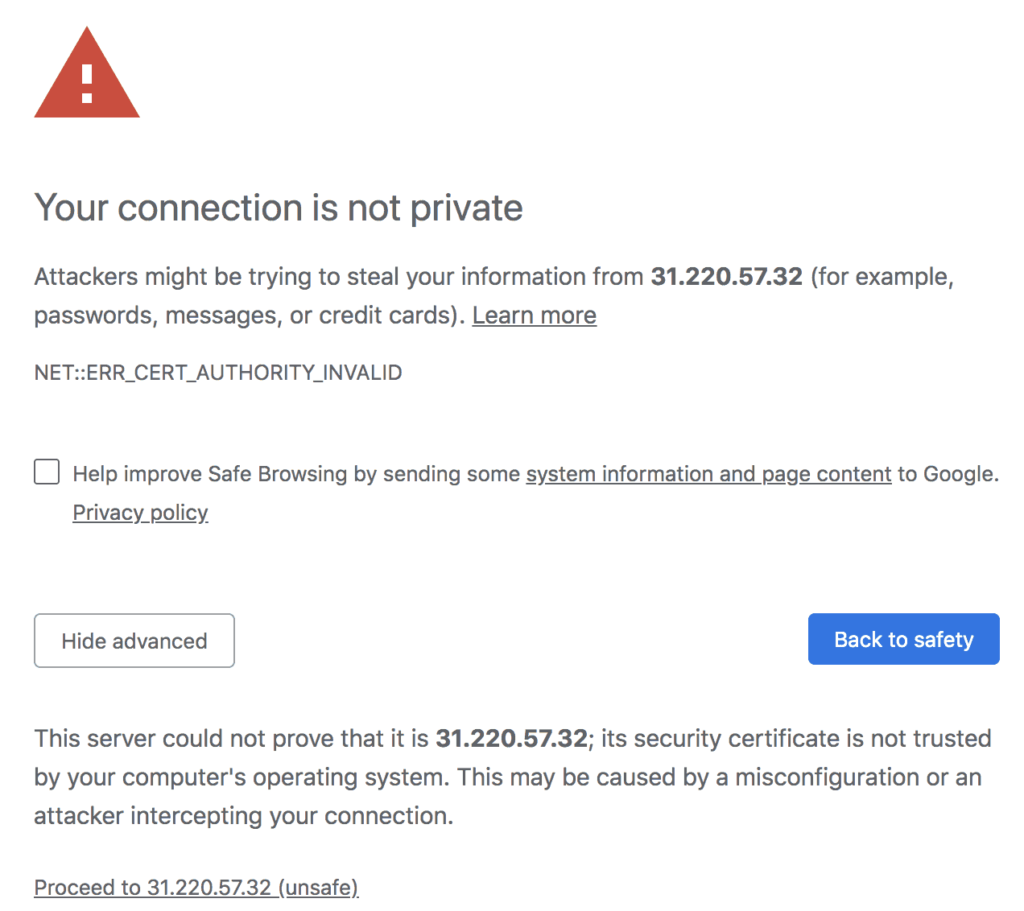 If you’re getting your connection is not private warning, don’t worry. WHM uses a self-signed certificate, which is not recognized by your browser. If you use Chrome, simply click the Advanced button and select Proceed to IP Address (unsafe).
