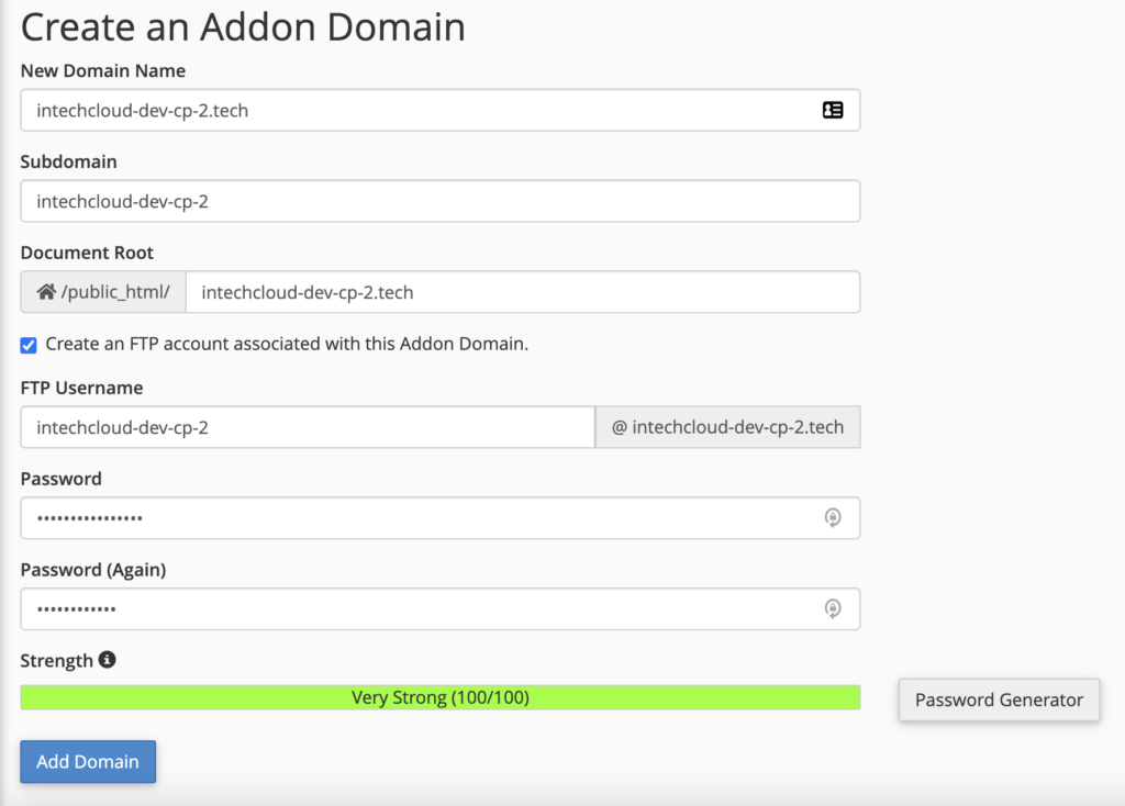 - Create an FTP Account (Optional) — this option allows you to create a different FTP account for the new addon domain. If you’re going to manage that domain yourself, you don’t need to create one. However, if you wish to set up the addon domain for someone else, you can check the Create an FTP account associated with this Addon Domain. With a separate account, they will only have access to the files of that particular addon domain