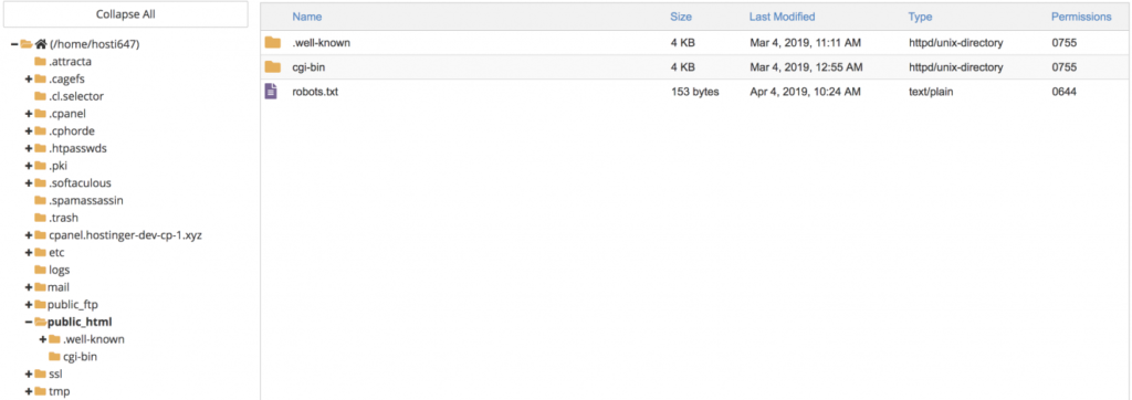 First of all, there’s a window section that shows you a folder tree on the left, and a folder’s contents on the right. You can navigate to a folder by clicking on the appropriate one. For example, clicking the public_html folder will show you its content – .well-known, cgi-bin, robots.txt, etc.