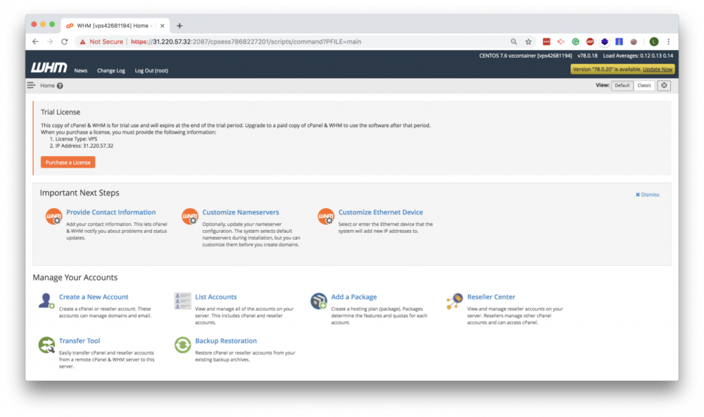 If you’re using Intech Cloud, once you’ve subscribed to VPS hosting, you’ll get the option to have a server run on CentOS 7 with cPanel/WHM pre-installed. If that’s the case, you need to set up cPanel/WHM first.