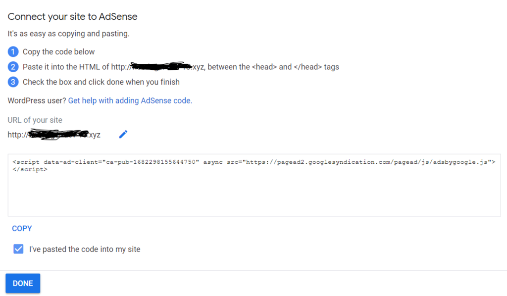 - On the Connect your site to AdSense page, there’s a set of code that you should embed to your site’s header. Remember, only copy the code and don’t click Done. Avoid closing the page, as well.