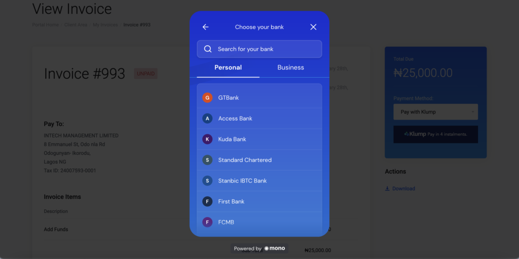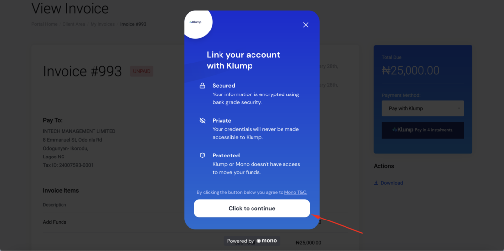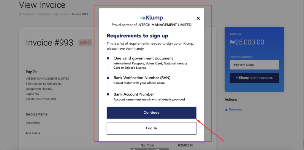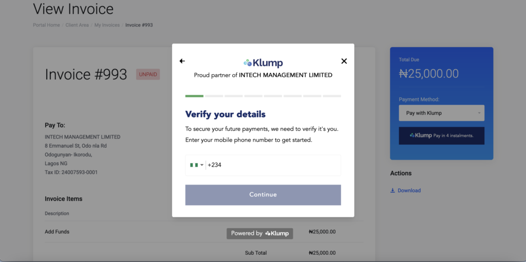 This service only applies to invoices that are between N25,000 to N300,000. So for example, if you need a Business Hosting from B-Premium to B-Business which ranges from N39,000 to N86,400 Annual Hosting Plans, you can pay with Klump but if you are getting a starter shared hosting plan that is worth N6,000, then you can’t pay with Klump.