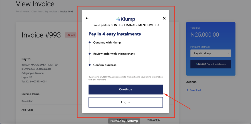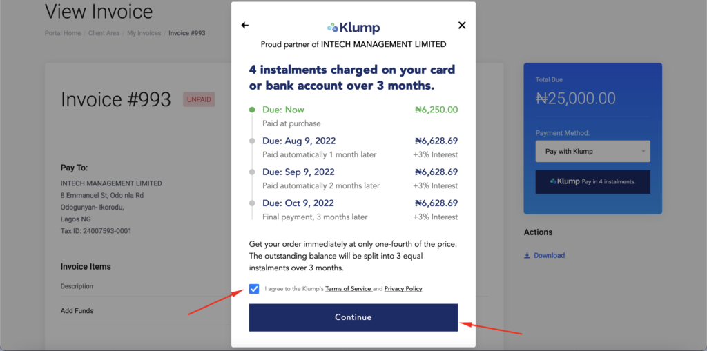 Visit Intech Cloud Hosting website and select any product or service you wish to buy and pay in instalments. Please note that the Klump payment gateway only applies to invoices that are between N25,000 to N300,000.