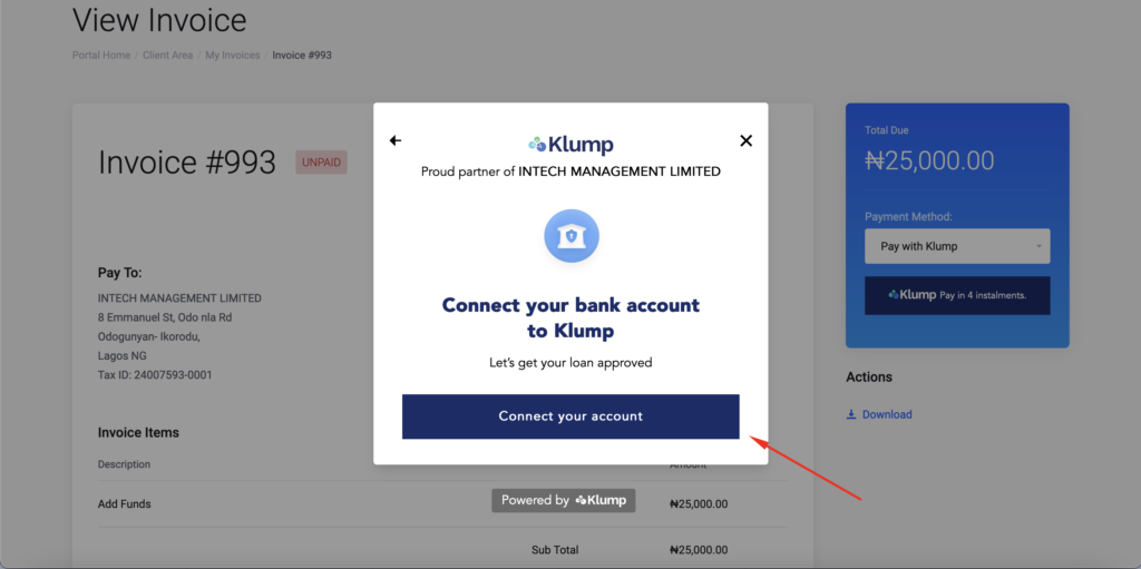 Once this has been completed, connect your bank account to Klump payment gateway and input your details for the first debit.
