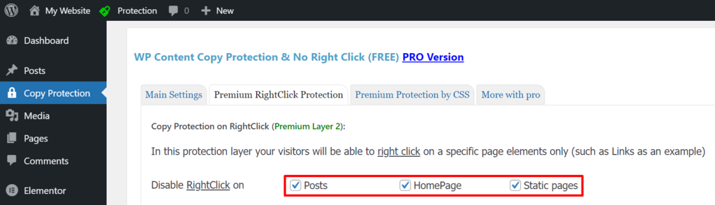 - Select the types of pages where you want to enable right-click protection. You can allow it on Posts, the Homepage, and other Static pages.